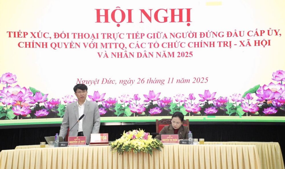 Sáng 26/11, Đảng ủy – HĐND – UBND – UBMTTQ xã Nguyệt Đức tổ chức hội nghị tiếp xúc đối thoại giữa người đứng đầu cấp uỷ, chính quyền với MTTQ, các tổ chức chính trị – xã hội với nhân dân năm 2025. Đồng chí Nguyễn Thị Huấn – Bí thư Đảng ủy, Chủ tịch HĐND xã và đồng chí Nguyễn Lê Huy – Phó Bí thư Đảng ủy, Chủ tịch UBND xã đồng chủ trì hội nghị.